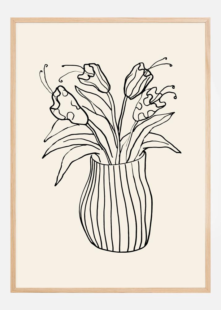 Un poster stilizzato con fiori in un vaso. Le linee nere forti e audaci delineano grossolanamente i fiori nel vaso. Su uno sfondo bianco i fiori emergono chiaramente. Aggiungi un po' di colore all'immagine appendendola a una parete luminosa e audace.