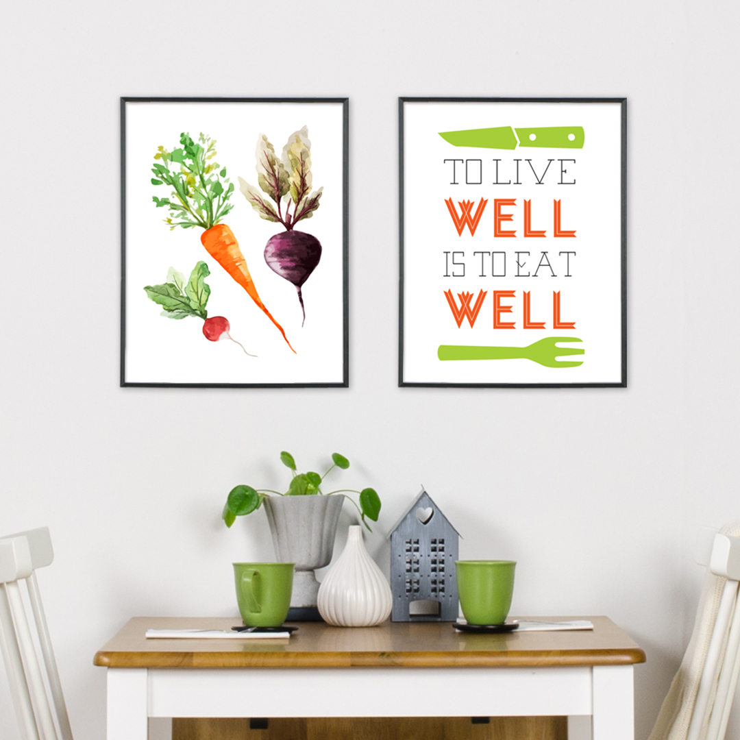Stampa grafica con una bellissima illustrazione di un ravanello, una carota e una barbabietola. Il poster è altrettanto bello da appendere in cucina come su una parete con tema giardino in soggiorno, o forse nella stanza dei bambini sopra la cucina giocattolo. Lo stile pulito della stampa si adatta bene a tutti gli stili di arredamento, dallo stile country alla decorazione retrò e a uno stile nordico elegante. Completalo con una cornice che si abbini all'arredamento della stanza per creare un senso di completezza nell'ambiente. Quadri da cucina spesso si abbinano molto bene con cornici argentate che si abbinano al lavello, al rubinetto e ad altri dettagli metallici che solitamente si trovano in una cucina.