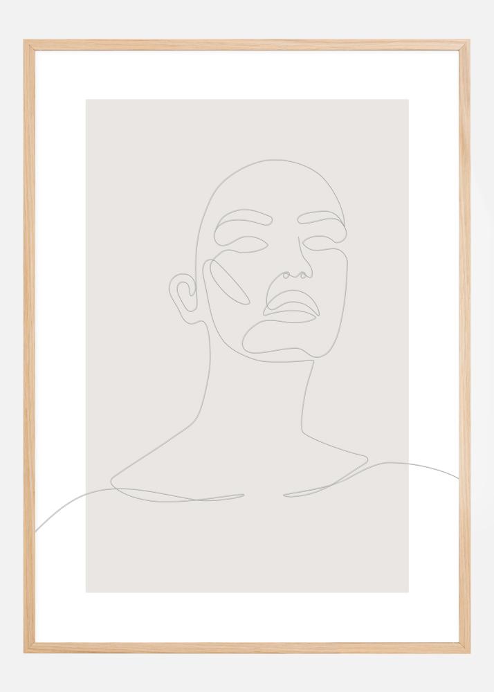 Un unico poster di ritratto astratto con un volto composto da una sola linea. La sottile linea nera si muove senza sforzo sulla pagina per creare un volto completo in un solo tratto. Lo sfondo grigio morbido assicura che si guardi attentamente l'immagine per apprezzare tutti i dettagli.