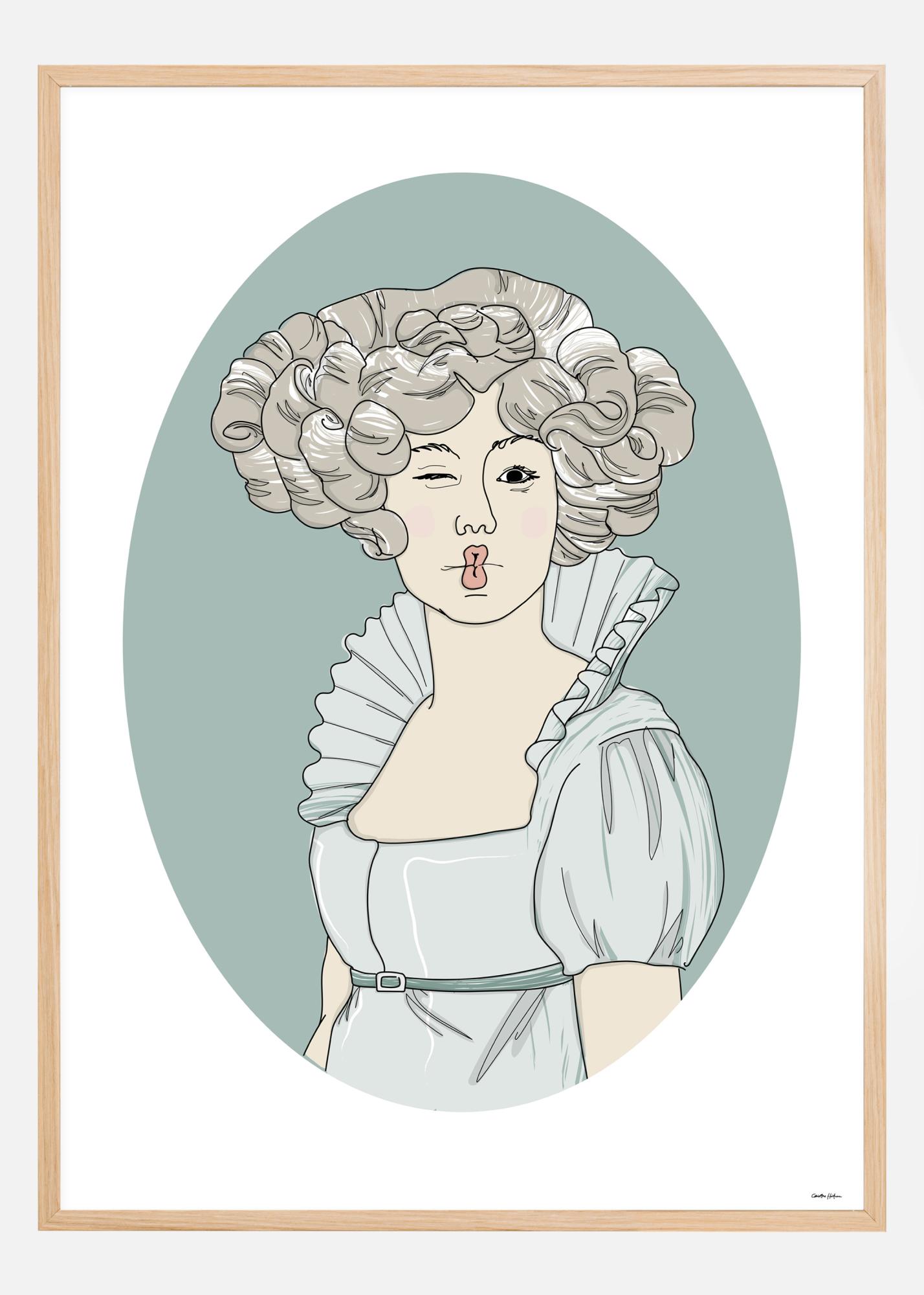 Un poster audace con una Violetta vittoriana che sfacciatamente sbuca dall'immagine con le labbra arricciate in un bacio. I suoi ricci grigi si abbinano al morbido vestito blu-grigio con il colletto alto. L'immagine è anche in un ovale blu per imitare le vecchie medaglie e creare un'opera d'arte unica e stravagante.