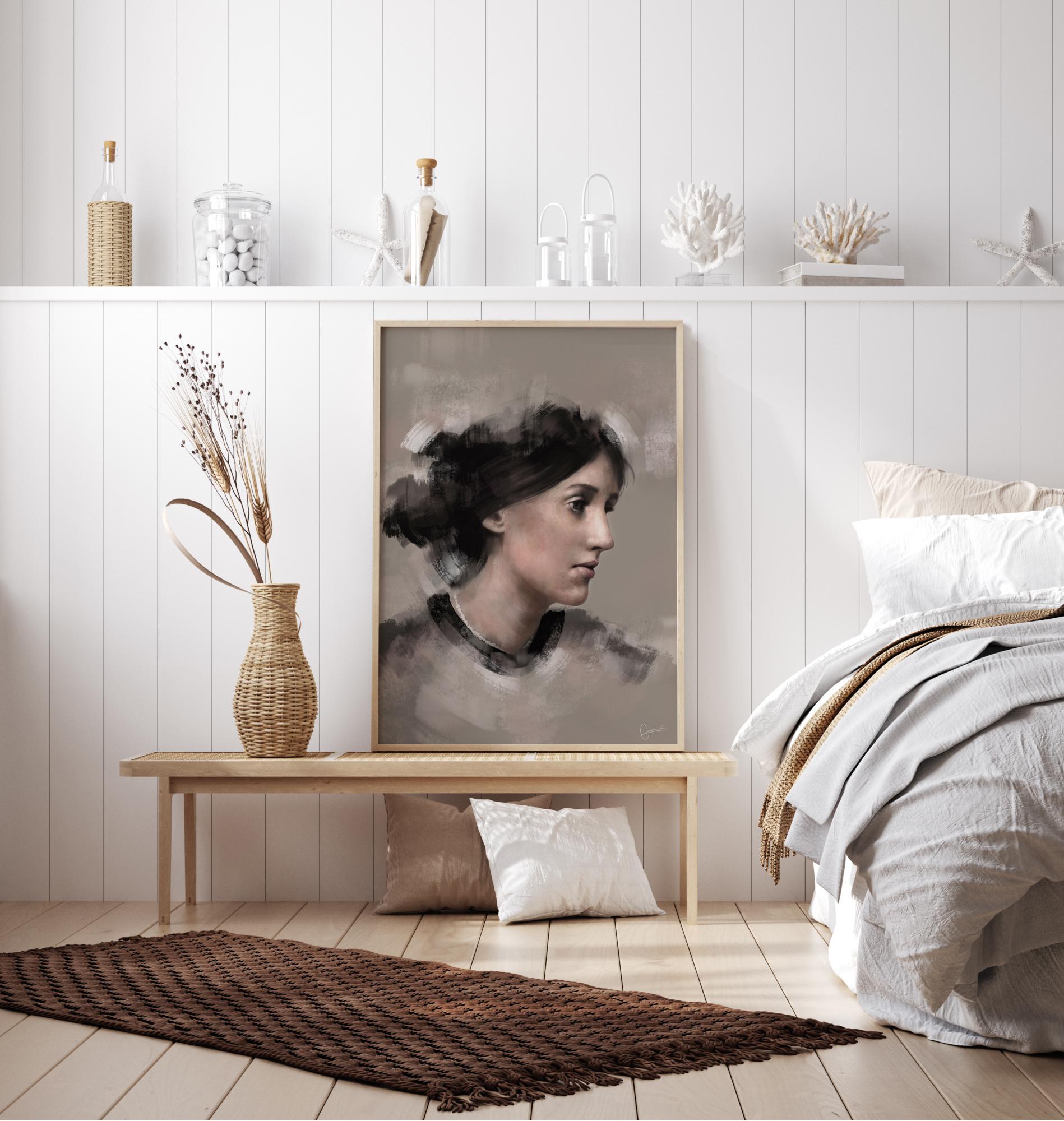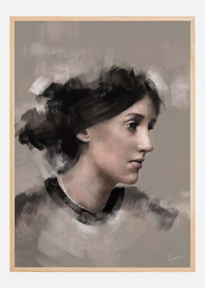 Un poster ritratto di Virginia Woolf di profilo. I suoi capelli sono semplici pennellate di colore morbide, ma il suo viso è rappresentato con dettagli accurati. Il ritratto è morbido e femminile e conferisce un tono quasi malinconico al suo viso mentre guarda lontano.