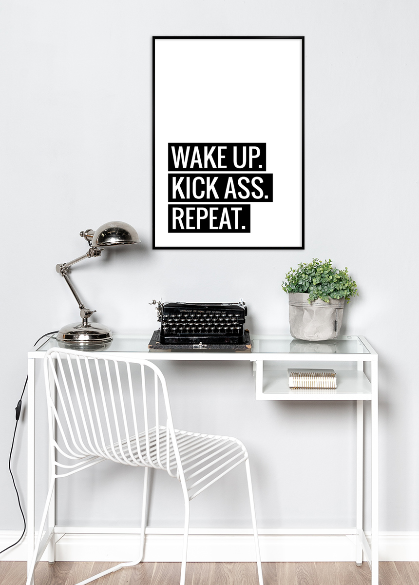 Essere fantastici ogni giorno a volte risulta difficile. Non c'è niente di cui vergognarsi! Invece, incoraggiati ad esserlo mettendo questo poster sul muro. Il poster ha un design semplice ed elegante con uno sfondo bianco e una scritta nera che recita "Wake up. Kick ass. Repeat." Disponibile in 6 formati e fasce di prezzo diverse. Puoi anche abbinarlo a una cornice nera o colorata dal nostro vasto assortimento.