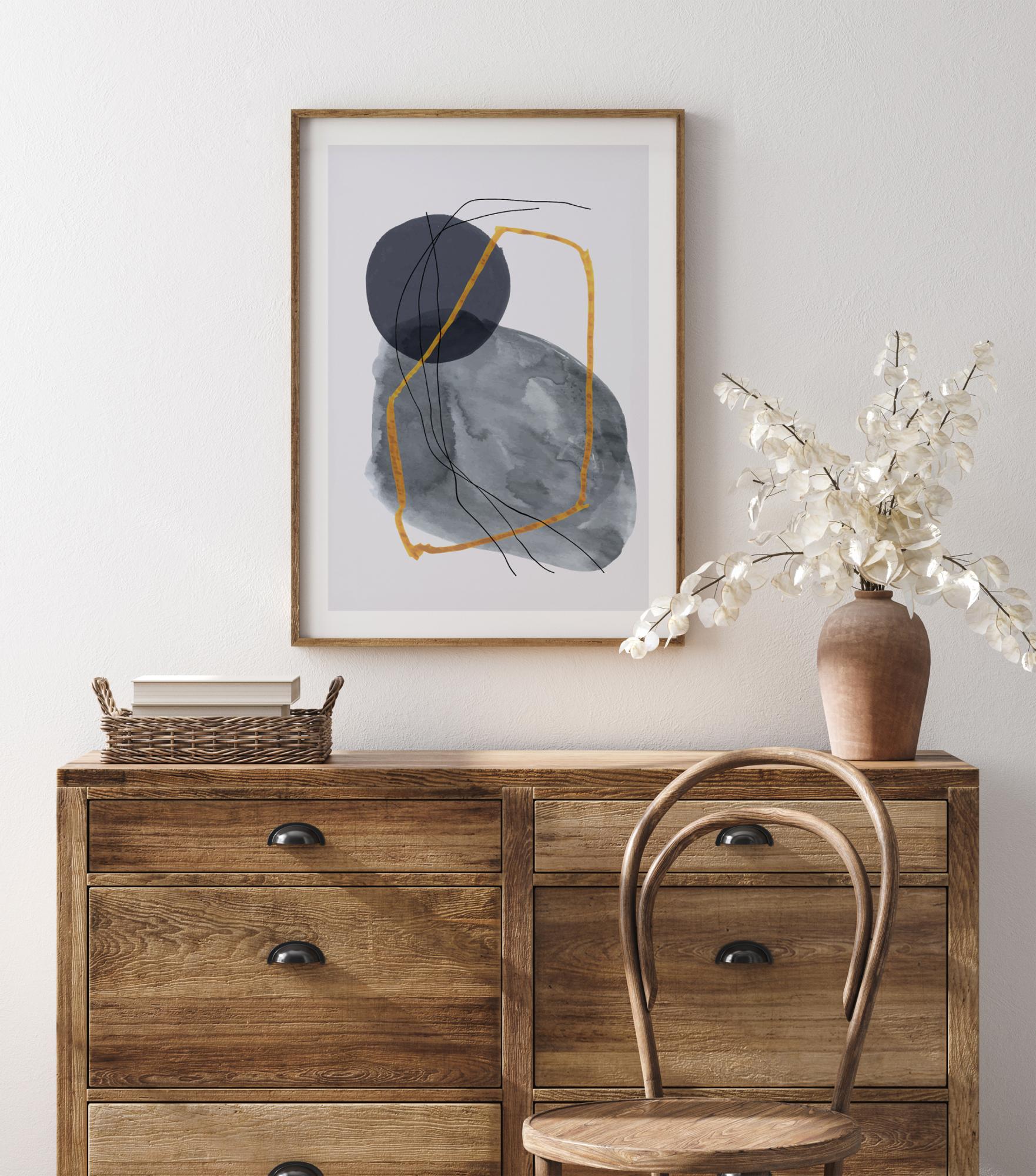 Un poster geometrico con diverse forme blu su uno sfondo grigio. Una grande forma blu dipinta riempie lo schermo con un cerchio grigio morbido sopra di essa. Linee nere si intrecciano e c'è una linea dorata spessa che crea una terza forma sulla parte superiore per un'immagine unica e interessante.