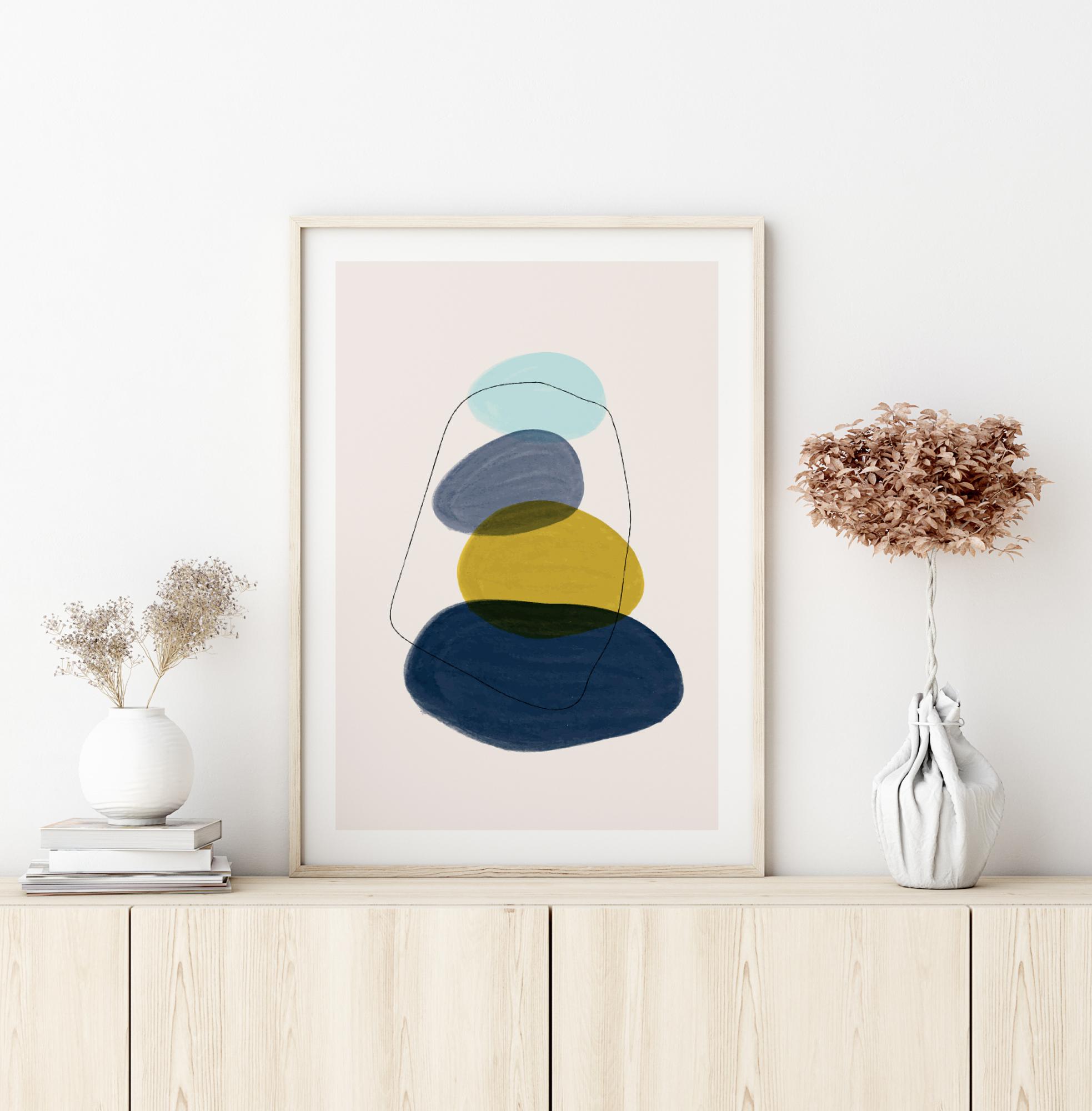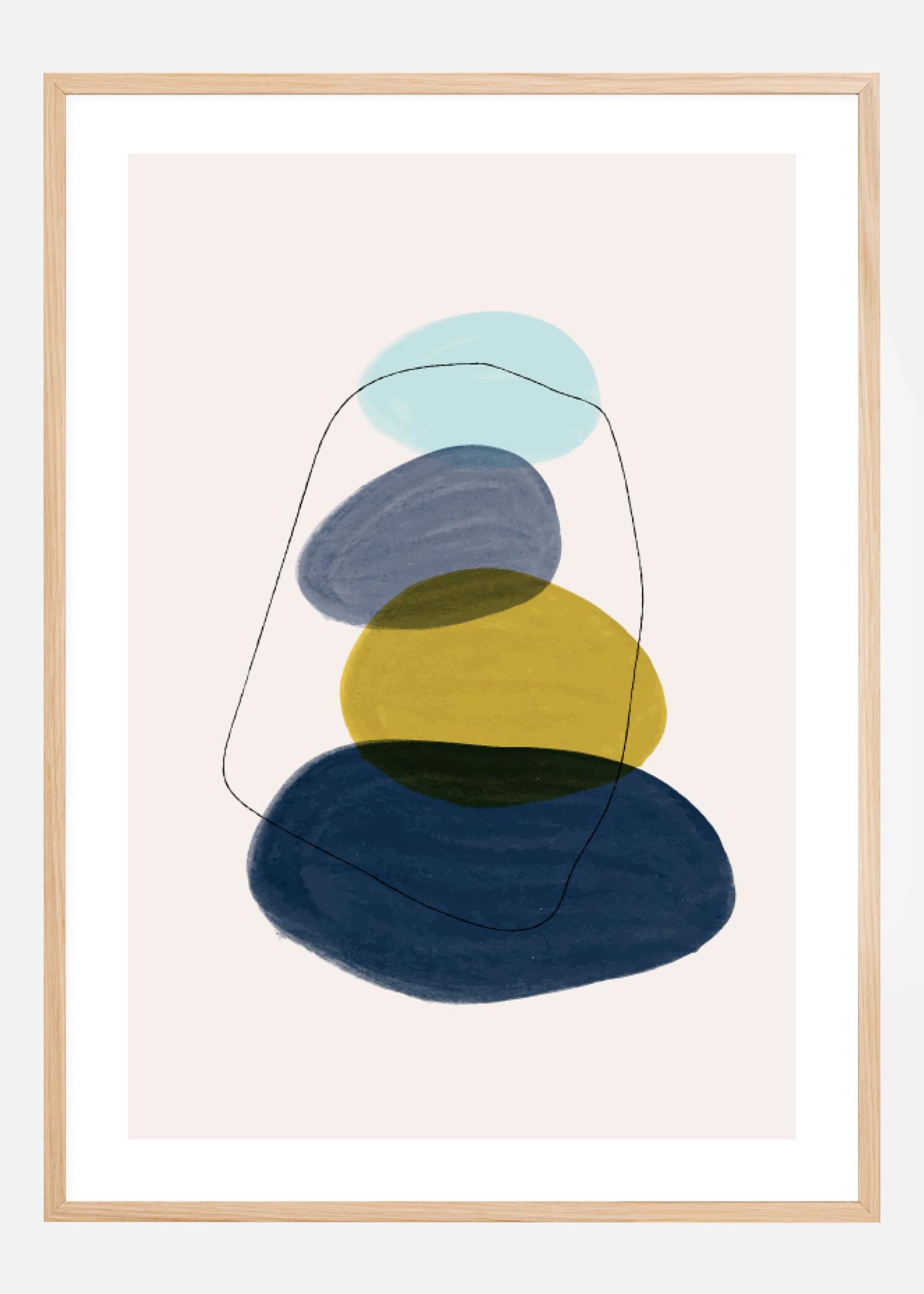 Un divertente poster astratto con diverse forme rotonde che sembrano rocce. Le forme iniziano grandi e diventano gradualmente più piccole quando vengono impilate l'una sull'altra in questa divertente immagine. I colori blu scuro, blu chiaro e giallo in questa immagine rendono questa opera luminosa e rinvigorente per la tua casa.