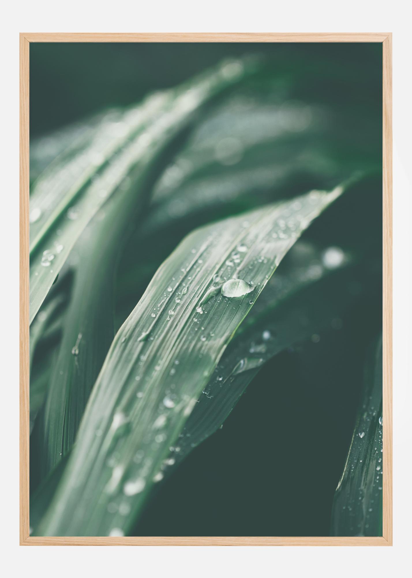 Un macro poster con foglie e gocce d'acqua. Le foglie verde scuro riempiono l'immagine con le loro venature in dettagli nitidi. Le gocce d'acqua seguono le curve delle foglie e cadono verso i bordi dell'immagine. Appendilo su una parete di colore terra morbido per creare un'atmosfera di foresta.