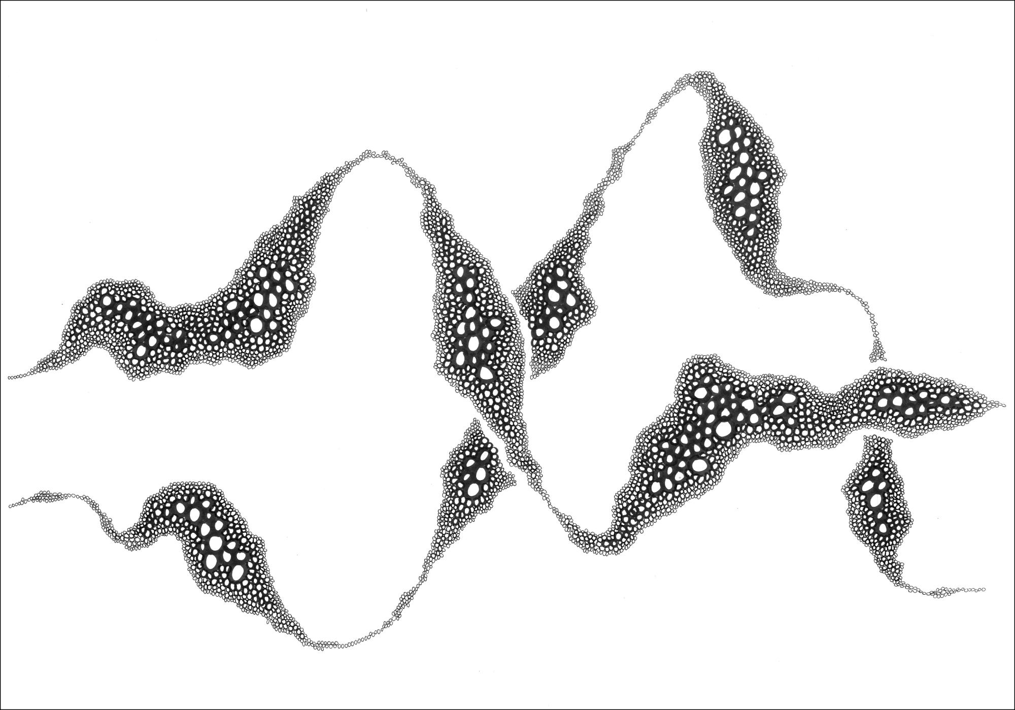 Un poster astratto e drammatico con diverse cerchie nere e bianche che creano strane onde ondulate su uno sfondo bianco. Ci sono cerchi grandi e piccoli come bolle attaccate a lunghe e ondulate stringhe che si avvolgono e si intrecciano sull'immagine, incrociandosi in questa opera stranamente affascinante.
