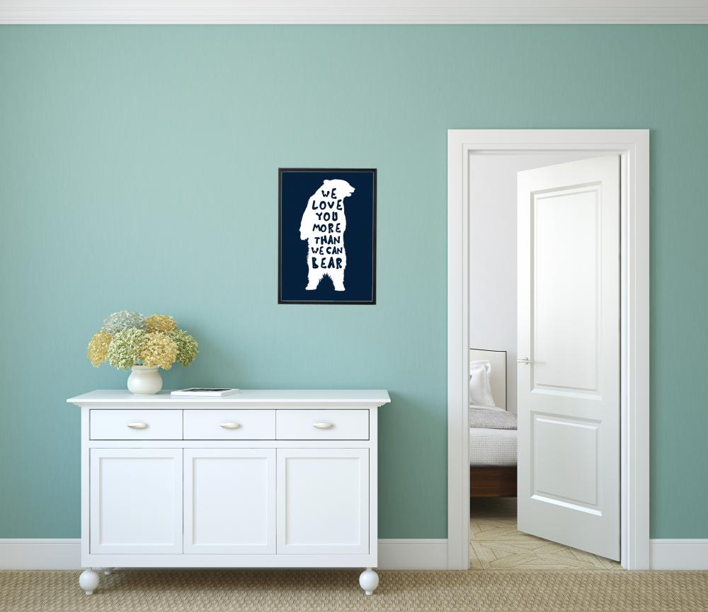 Un poster spiritoso e allo stesso tempo affettuoso adatto a chi ama particolarmente gli orsi. La stampa grafica è un bel regalo da fare a qualcuno per mostrare il proprio apprezzamento. Il poster ha una sagoma di un orso in bianco su uno sfondo scuro e un carattere artistico bianco per la citazione. Incornicia il poster con una cornice elegante e minimalista che si adatta all'arredamento generale per creare un'atmosfera armoniosa nell'ambiente.