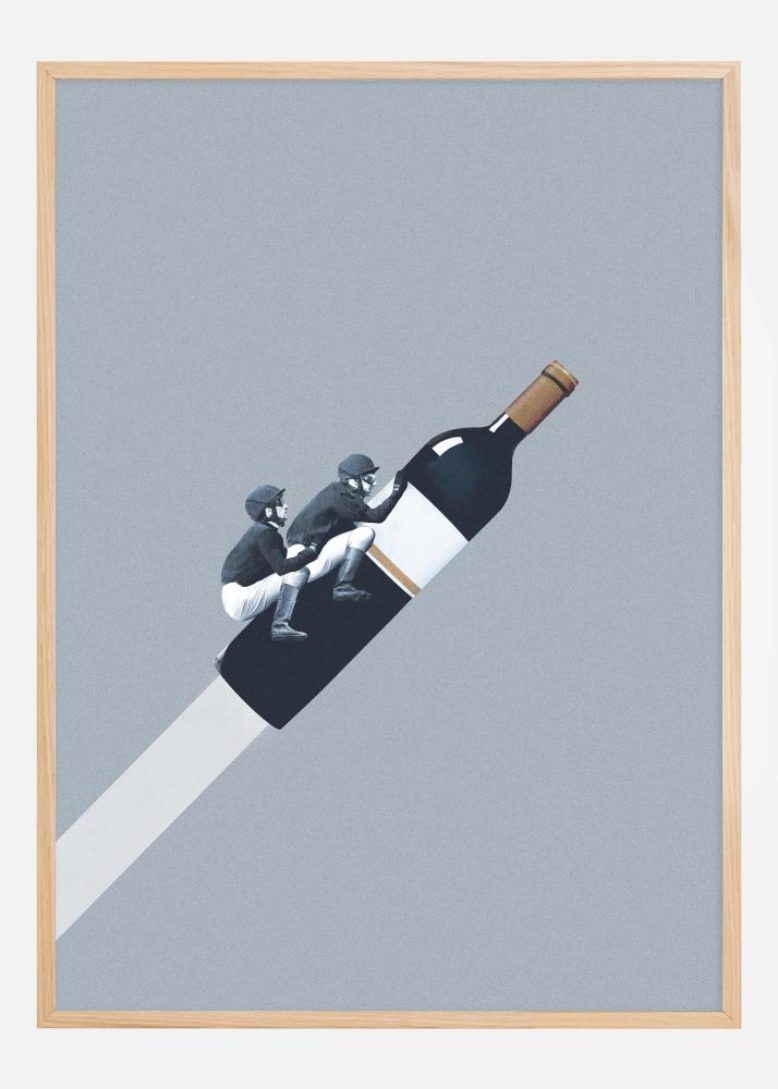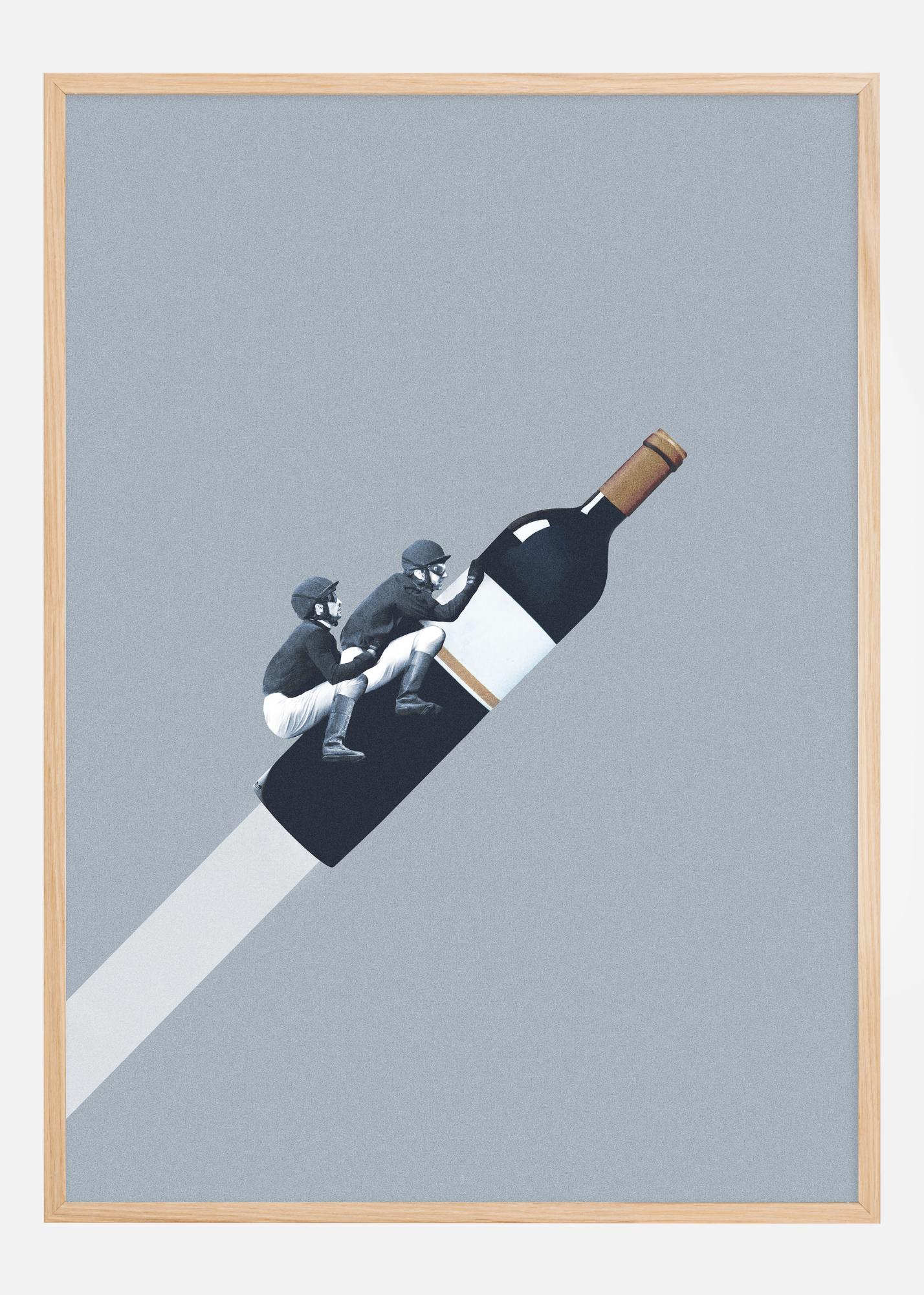 Questo poster unico e stimolante cattura una scena fantasiosa in cui due persone in abbigliamento classico da equitazione cavalcano trionfanti sopra una bottiglia di vino inclinata. La scena è un'opera di creatività immaginativa che intreccia il tradizionale con l'assurdo, e rappresenta un senso di avventura ed escapismo. Mostra come due cavalieri possano affrontare le onde vinicole della vita quotidiana con la stessa graziosa padronanza come se stessero cavalcando attraverso il paesaggio ondulato.