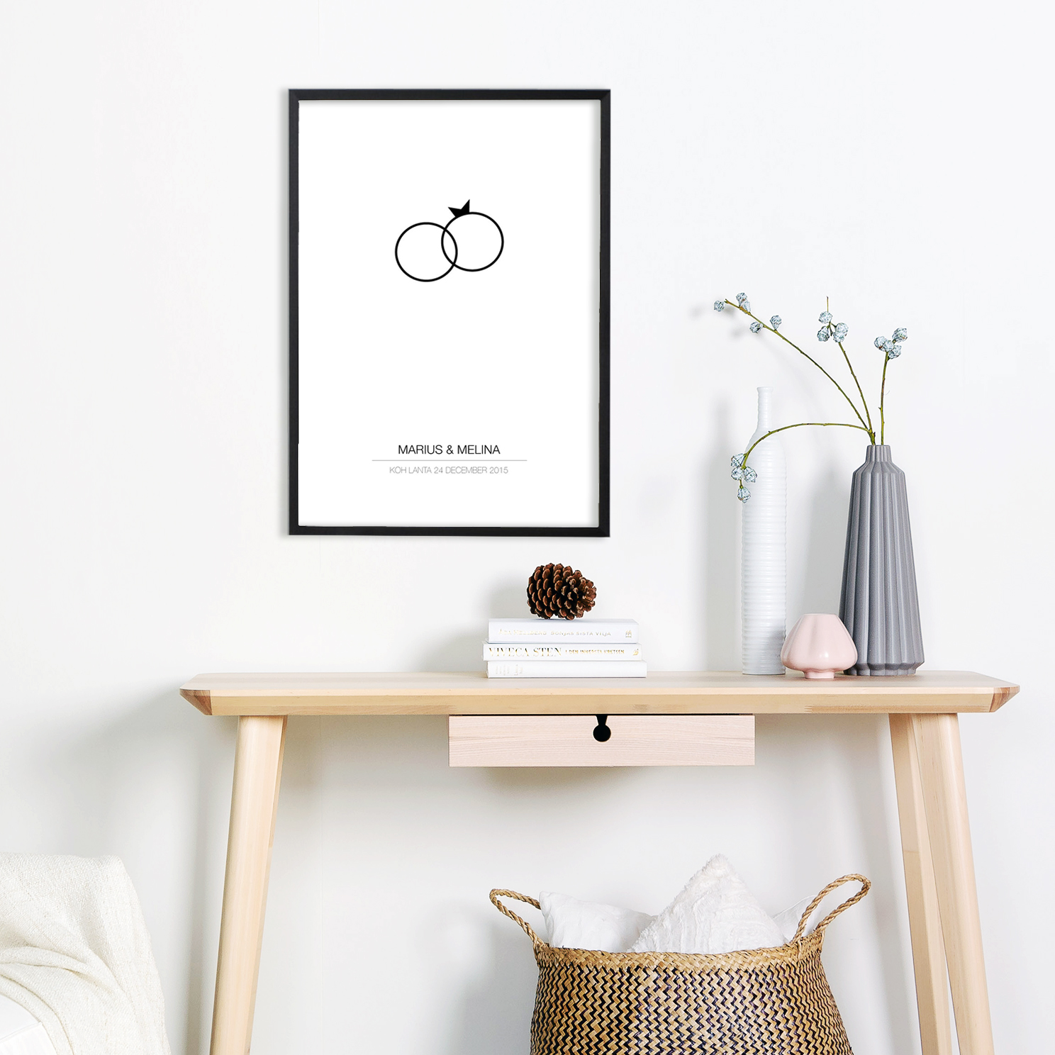 Un bellissimo poster con anelli di matrimonio simbolo dell'amore che è un regalo eccellente per le coppie appena sposate. Scrivi i nomi e la data del giorno felice e il poster verrà stampato esattamente come mostrato nell'immagine. È essenziale acquistare una bellissima cornice per completare il regalo. Scegli una cornice dal nostro vasto e di alta qualità assortimento e ordina il regalo di nozze perfetto oggi stesso.