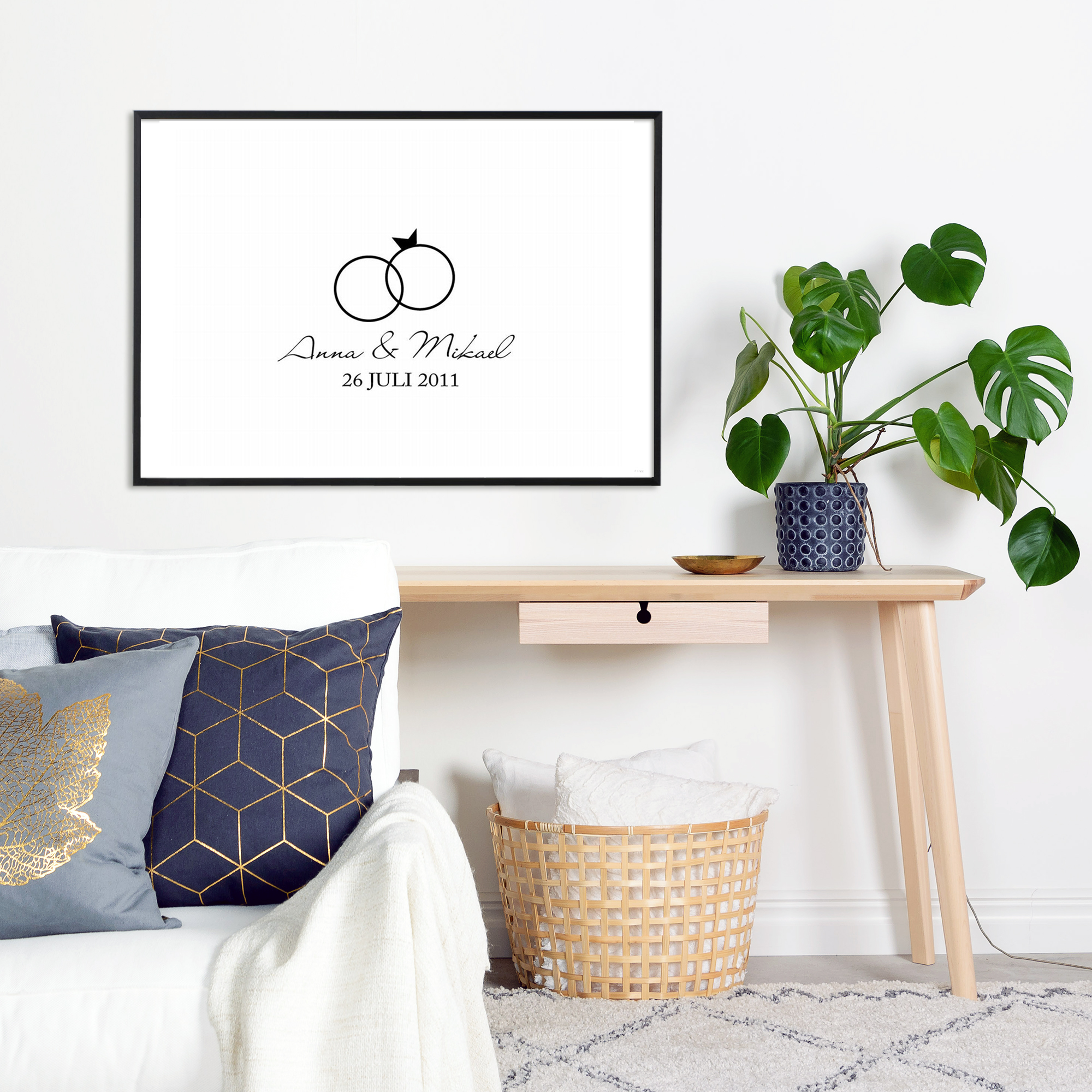 Un bellissimo poster con anelli di matrimonio simbolo dell'amore che è un regalo eccellente per le coppie appena sposate. Scrivi i nomi e la data del giorno felice e il poster verrà stampato esattamente come mostrato nell'immagine. È essenziale acquistare una bellissima cornice per completare il regalo. Scegli una cornice dal nostro vasto e di alta qualità assortimento e ordina il regalo di nozze perfetto oggi stesso.