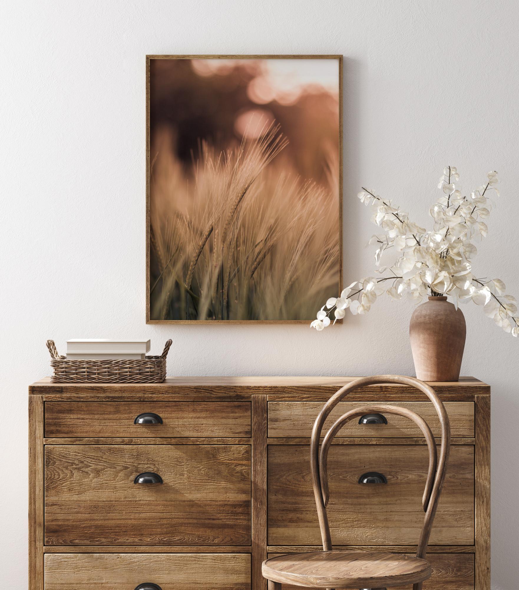 Un poster con spighe di grano nel tardo pomeriggio. La luce rosa morbida fa intravedere le spighe dorate di grano e crea un'immagine morbida, quasi magica. Trasforma il quotidiano in qualcosa di bello quando appendi questa stampa su una parete neutra e morbida per creare una sensazione di tranquillità.