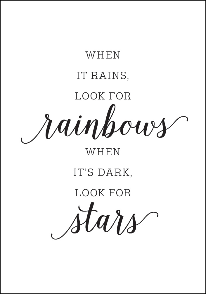 Una stampa ispiratrice con una citazione potente che dovrebbe essere il modo in cui vivi la tua vita. Quando piove, cerca gli arcobaleni, quando è buio, cerca le stelle. Parole da vivere in questo semplice stampa in bianco e nero. Goditi questo e guarda il lato luminoso della vita, indipendentemente dal momento della giornata in cui ti fermi e leggi questo.