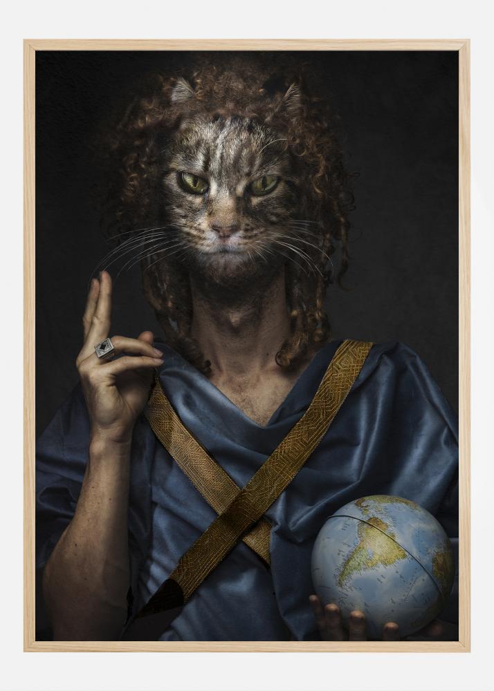Questo poster unico mostra un'immagine originale e stimolante in cui la testa di un gatto è stata posta su una figura umana. Il motivo presenta uno sfondo profondo e scuro che contrasta fortemente con lo sguardo chiaro e acuto della figura. La parte umana della figura è vestita con una tunica blu ricca, bordata con dettagli dorati che conferiscono una sensazione di eleganza e forza. La mano della figura tiene un globo antico, che aggiunge una dimensione di saggezza e consapevolezza globale. Nell'immagine dominano colori come il blu profondo, l'oro, e tonalità di marrone e beige che si fondono per creare un poster sia misterioso che iconico.
