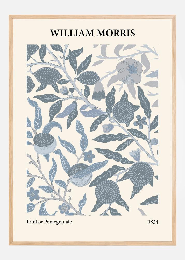 Questo poster dettagliato ed elegante mostra il design iconico di William Morris "Frutto o Melograno", qui raffigurato con una colorazione rinfrescante ed elegante. La sofisticata disposizione dei melograni mescolati con varie forme di foglie e fiori crea una sensazione di natura vivace e prosperosa. La palette di colori discreta del poster, con sfumature di blu e grigio su uno sfondo cremoso, dà un'impressione sofisticata e contemporanea che si adatta perfettamente a una vasta gamma di stili di arredamento.