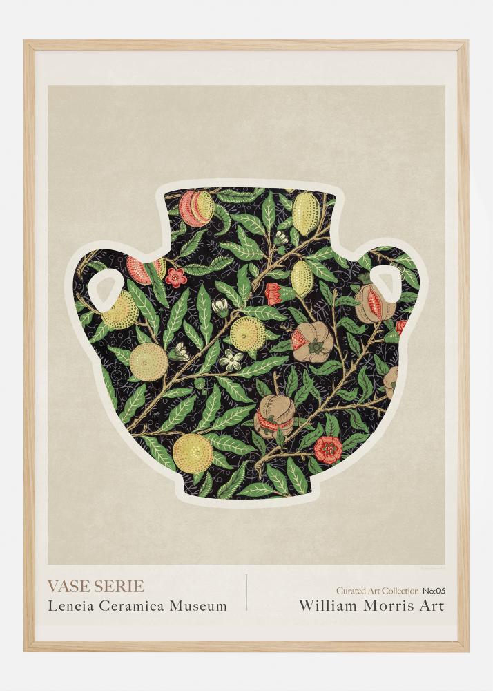 In questo poster, numero 05 della "Curated Art Collection" presso il Museo Lencia Ceramica, riviviamo l'influenza senza tempo di William Morris nell'arte e nel design. L'opera presentata è un vaso stilizzato con un design intricato e decorato, pieno di un incantevole miscuglio di elementi botanici e motivi a frutta, che riflette la passione di Morris per la natura e la sua capacità di intrecciare le forme naturali nel suo lavoro.