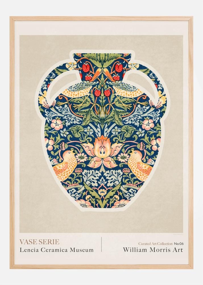 Il poster numero 06 nella nostra "Curated Art Collection" presso il Lencia Ceramica Museum è un ricco omaggio all'artigianato artistico di William Morris. Raffigura un vaso adornato con un motivo simmetrico e dettagliato, vivace con motivi di uccelli e fiori iconici per la filosofia di design di Morris. Ogni elemento di questo motivo è pensato per omaggiare la bellezza della natura e la capacità dell'arte di imitarla.