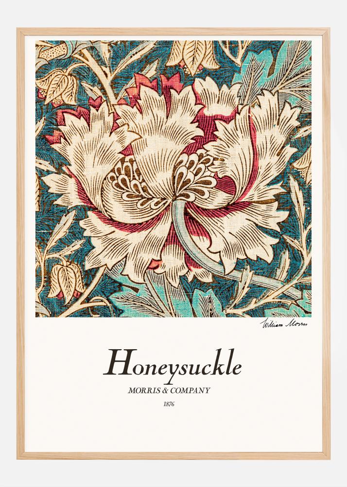 Questo poster presenta "Honeysuckle", un delizioso motivo di William Morris, creato per Morris & Company nel 1876. Il motivo è un ricco intreccio floreale, con le curve sinuose e i fiori della caprifoglio in splendide tonalità di rosso, crema e blu. Lo sfondo, in una tonalità blu più intensa, mette in risalto i fiori e le foglie elegantemente modellati, creando una composizione profonda e complessa che è allo stesso tempo accattivante e senza tempo.