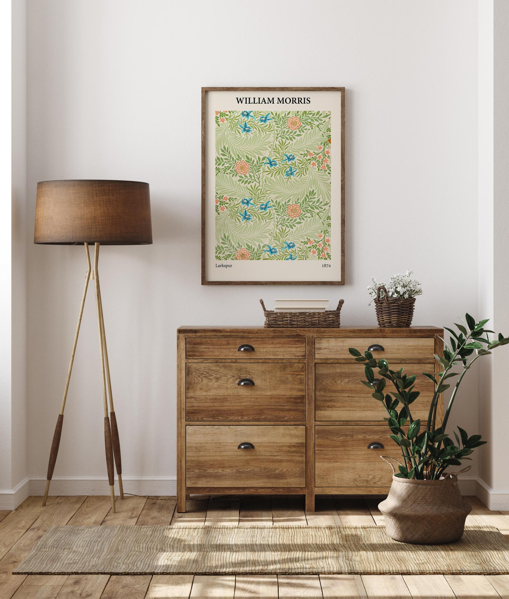 Un classico poster con una stampa di William Morris di delphinium. I colori pastello morbidi come pesca, blu e verde rendono questa stampa divertente da appendere al muro. Goditi il motivo ripetitivo e sentiti tranquillo dai colori morbidi contenuti in questa stampa.