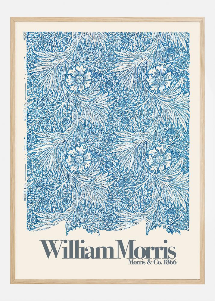 Questo poster mostra un classico motivo di William Morris chiamato "Marigold", creato da Morris & Co. intorno al 1866. L'iconico motivo, noto per i suoi elementi intricati e ispirati alla natura, è realizzato in un colore blu profondo su uno sfondo pulito color crema. Ogni dettaglio nella disposizione floreale è accuratamente scolpito, mostrando il senso di bellezza di Morris nel naturale e una capacità di trasformarlo in opere d'arte che sono senza tempo e amate ancora oggi.