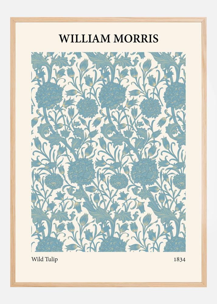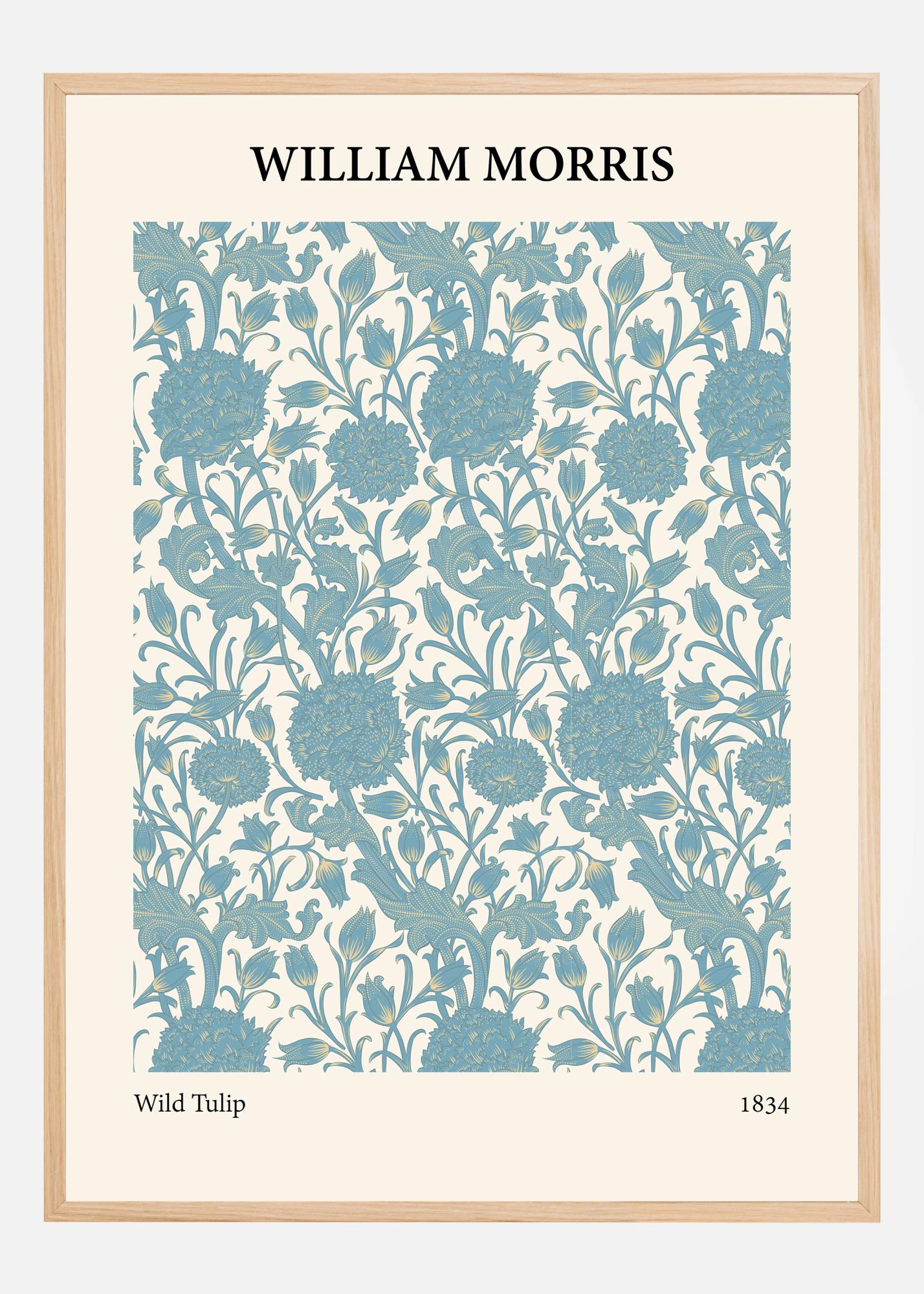 Questo poster di William Morris, intitolato "Wild Tulip", è una vivace rappresentazione dell'amore del movimento Arts and Crafts britannico per i dettagli e la complessità della natura. È una bellezza da ammirare, con un motivo di tulipani selvatici in uno spettro di tonalità blu, dal tenue azzurro cielo all'intenso blu mezzanotte, tutti elegantemente posizionati su uno sfondo color crema che mette in risalto la raffinatezza del motivo.