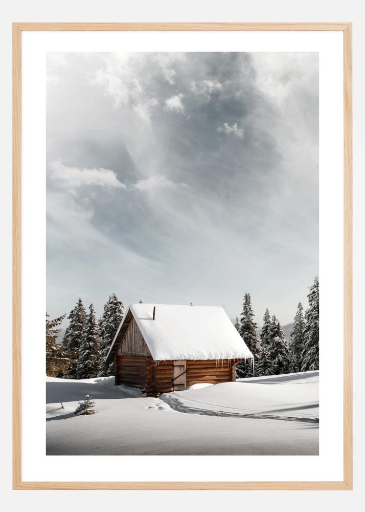 Un poster natalizio con una piccola casetta di legno in un paesaggio innevato. Una neve soffice copre il terreno e il tetto della casetta in questa immagine invernale. Gli alberi sono coperti di neve e nuvole di neve grigio scuro riempiono il cielo pronte a dare ancora più neve. Senti il freddo invernale in questa stampa elegante.