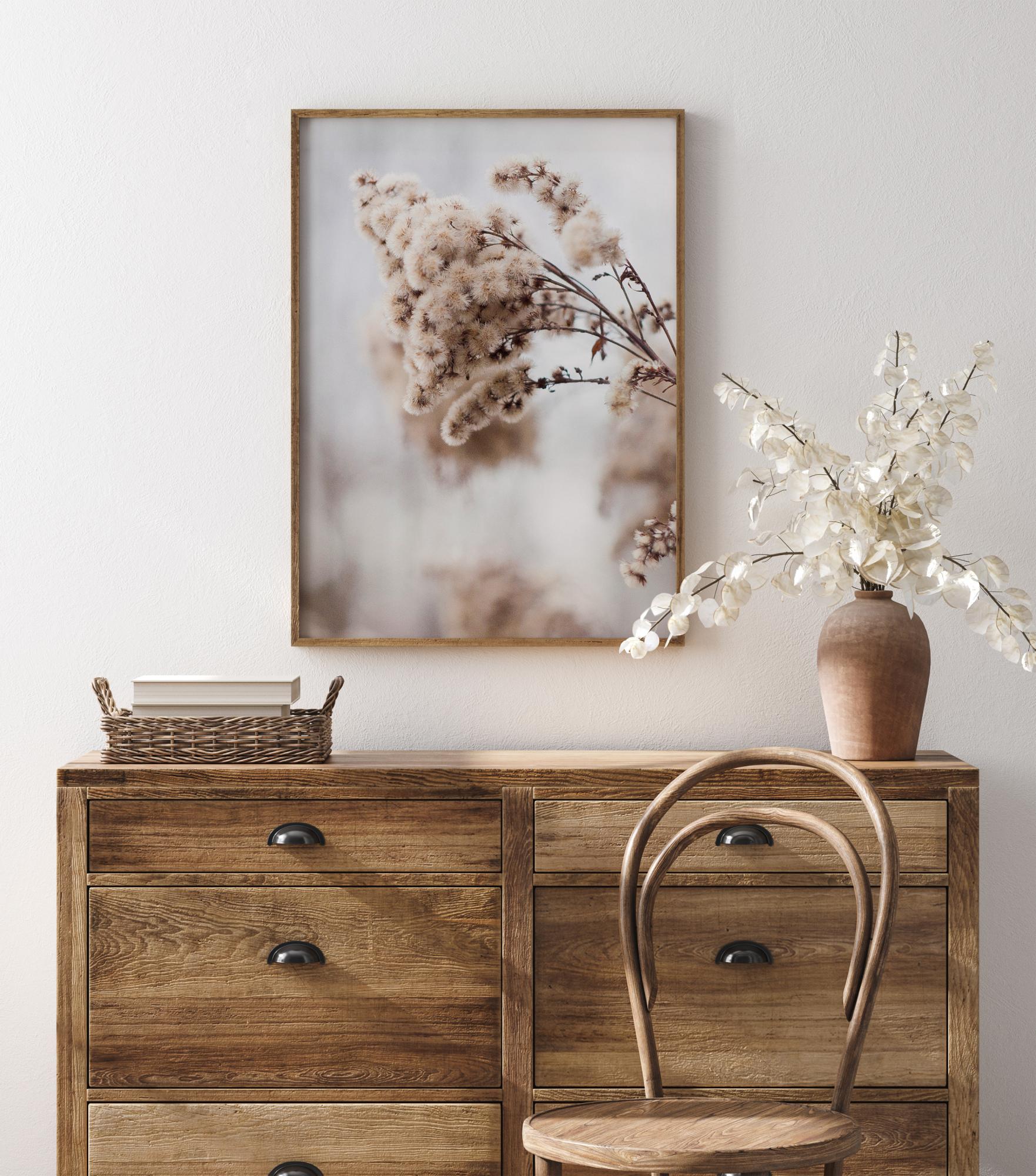 Un poster floreale con alcuni morbidi boccioli rotondi su un ramo. Il rosa di questi fiori spicca sullo sfondo morbido blu e grigio. Ammira i dettagli di ciascun bocciolo mentre si trovano in questa immagine stagionale invernale.