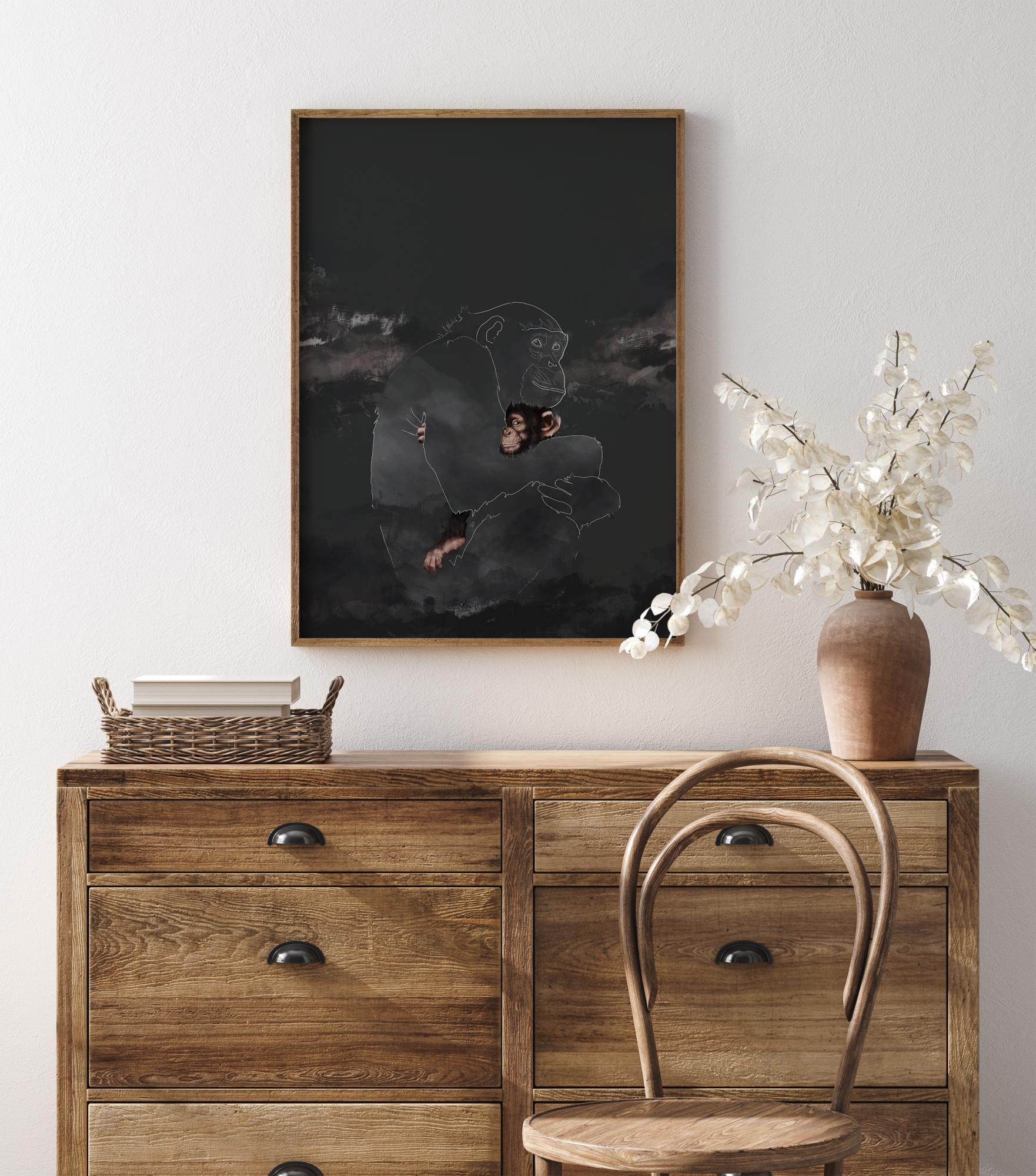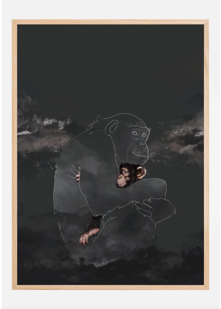 Un poster emotivo con un cucciolo di scimpanzé che abbraccia l'immagine mancante della sua mamma. Questa è un'immagine commovente quando il cucciolo di scimpanzé abbraccia solo i contorni della sua mamma che è seduta su nuvole soffici nel cielo nero.
