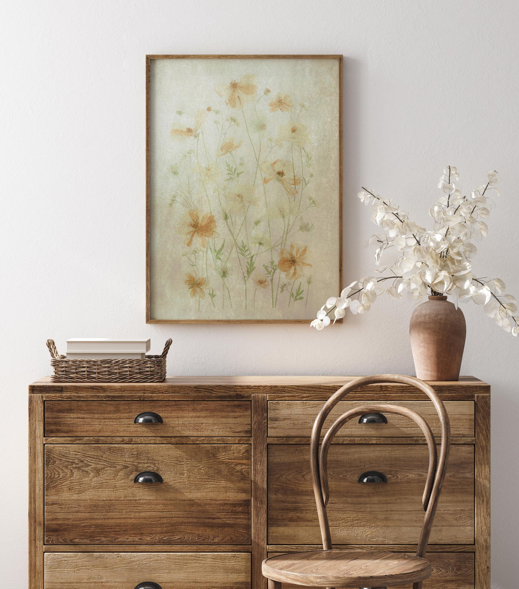 Un elegante poster con fiori arancioni morbidi e foglie verdi su uno sfondo bianco. L'effetto acquerello fa sembrare ogni pianta morbida e delicata. Tuttavia, ci sono dettagli fantastici in ognuna di queste immagini floreali morbide. Trasforma la tua casa in un giardino dell'Eden quando porti a casa questa stampa floreale.