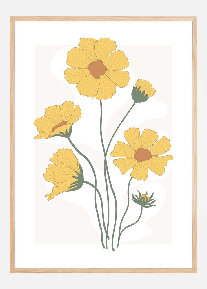 Un poster luminoso con calendule gialle create in uno stile di stampa divertente. Ogni fiore risplende sullo sfondo bianco. Nonostante sia un design stilizzato semplice, i fiori sono allegri e il modo perfetto per svegliarsi con un sorriso sulle labbra.