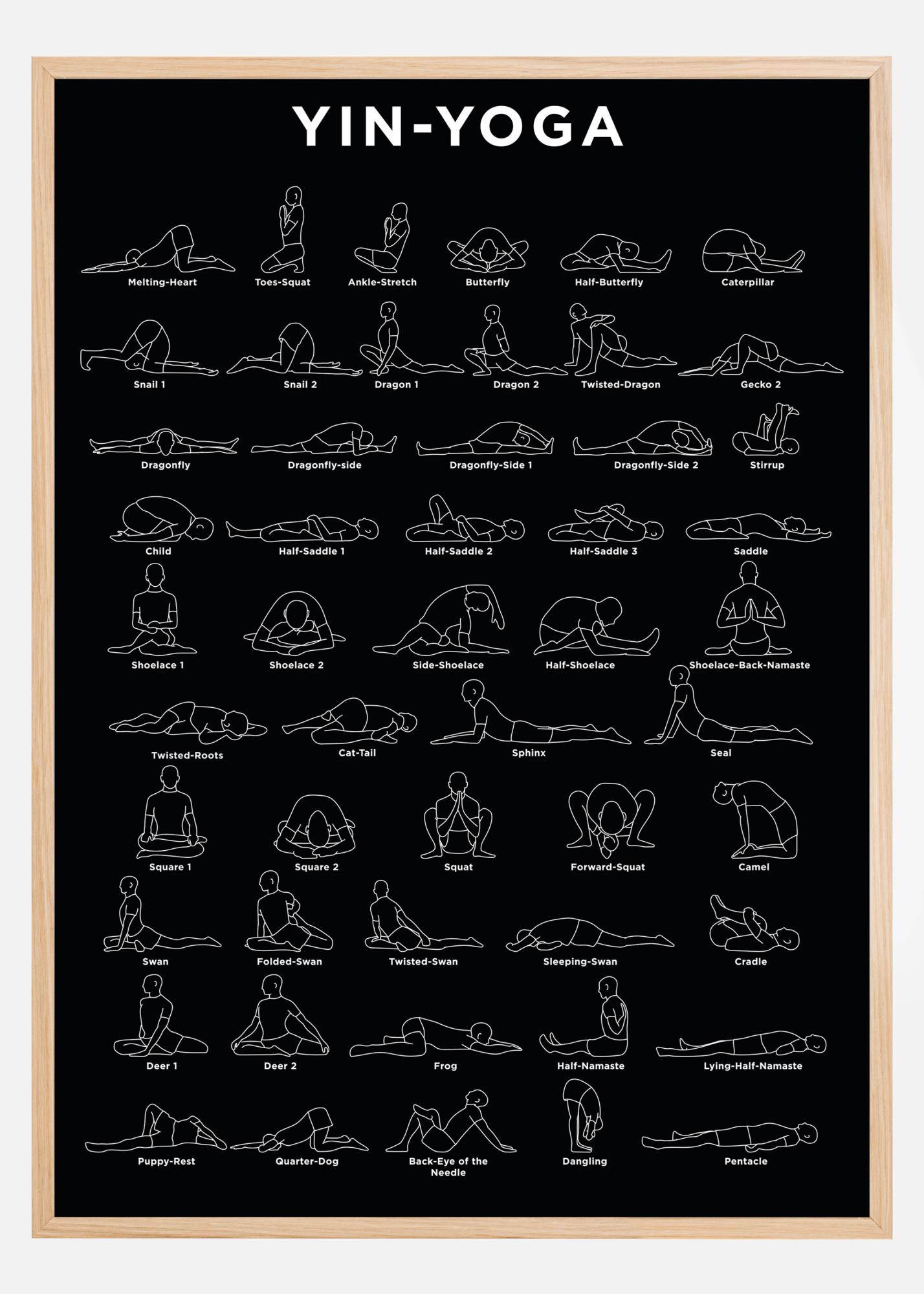 Un poster utile con le diverse posizioni che puoi fare nello yoga. Dai un'occhiata a questa immagine nera con ogni posizione di yin yoga disegnata come una semplice figura bianca. Impara le diverse posizioni con facilità quando la piccola figura mostra come farle. Diventa flessibile quest'anno quando inizi a fare stretching grazie a questa stampa!