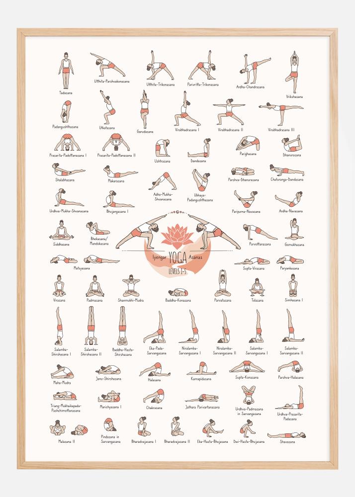 Al centro del poster è evidenziato il titolo 'Iyengar YOGA Asanas' circondato da un fiore di loto stilizzato, simbolo di purezza e risveglio spirituale nello yoga. Questo poster combina informazioni pratiche con un layout esteticamente piacevole, rendendolo un complemento perfetto per ogni studio di yoga, pratica domestica, o come parte di un arredamento ispirato a uno stile di vita sano. I colori tenui permettono al poster di essere sia un punto focale che una parte armoniosa del design complessivo della stanza.