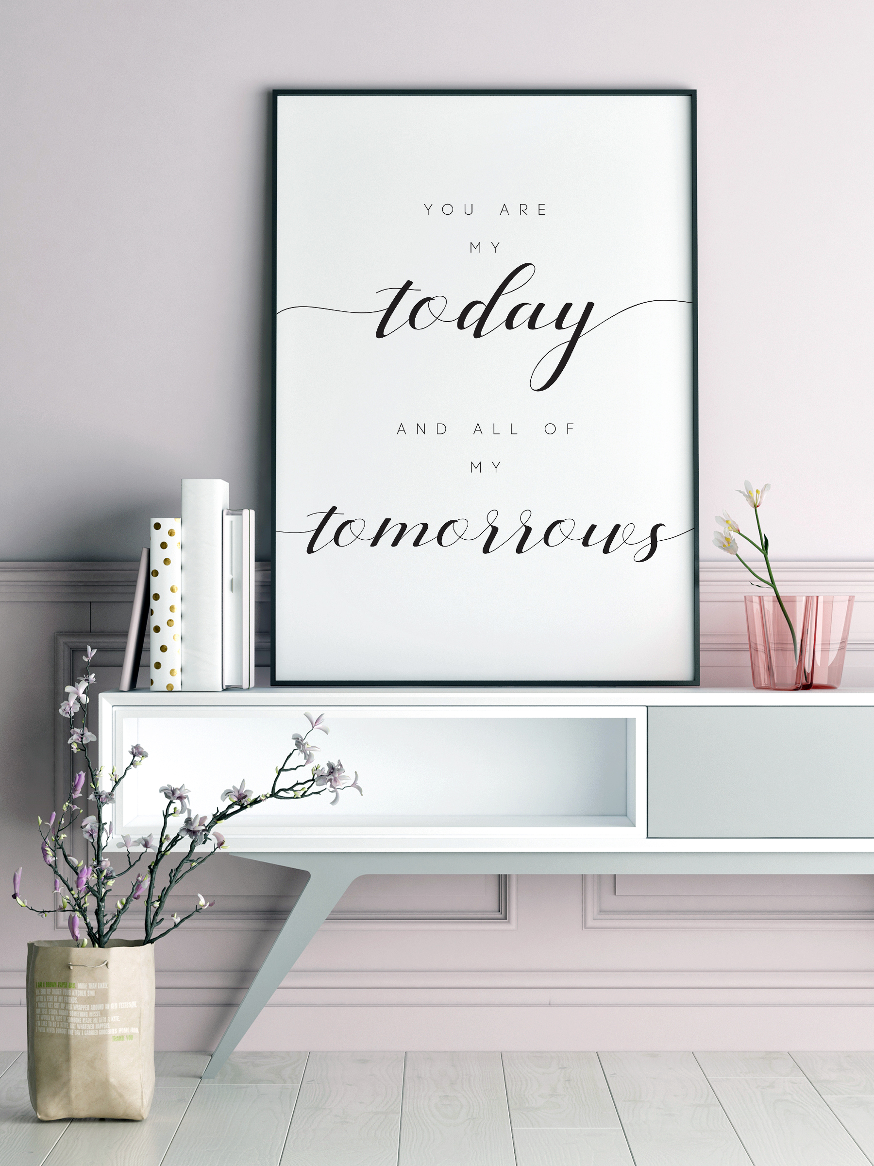Un poster motivazionale con una citazione forte che ti ispirerà ogni giorno. You Are My Today and All of My Tomorrows è il regalo perfetto per una persona amata per mostrare loro quanto li apprezzi. Posizionalo in un luogo dove possano vederlo ogni mattina.