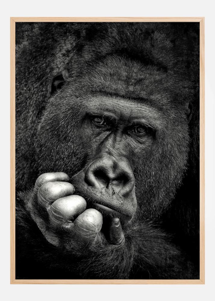 Un fantastico poster ritratto di un gorilla in una posa contemplativa. Il gorilla guarda verso la telecamera con uno sguardo sfocato. Una mano è piegata sotto il mento come se stesse riflettendo su questioni importanti. La stampa in bianco e nero mette in evidenza tutti i dettagli del volto di questa incredibile scimmia umana.