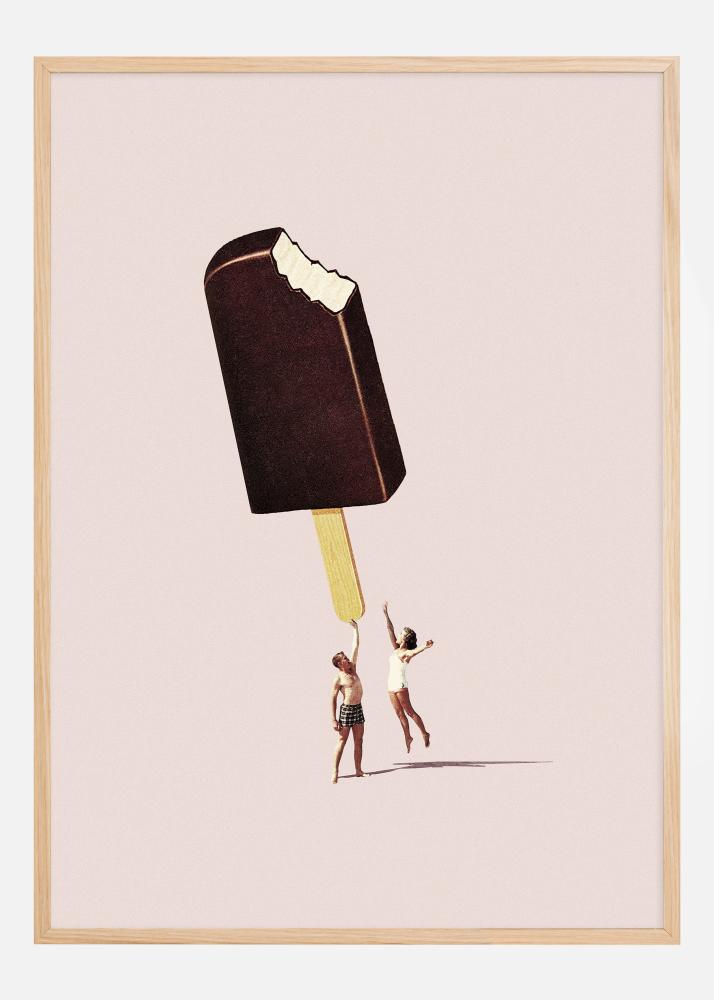 Questo delizioso poster mostra un'immagine unica e giocosa di due persone che sembrano aver trovato un gigantesco ghiacciolo! Con la sua composizione fantasiosa e uno sfondo pastello rosa caldo, questa immagine offre una sensazione di gioia estiva e nostalgia. Le figure felici, vestite con semplici costumi da bagno, si allungano verso il ghiacciolo, che ha un aspetto realistico con un morso mancante, creando un delizioso contrasto con l'ambiente minimalista. Questa scena creativa e vivace cattura l'attenzione dell'osservatore e suscita ricordi di giornate soleggiate.
