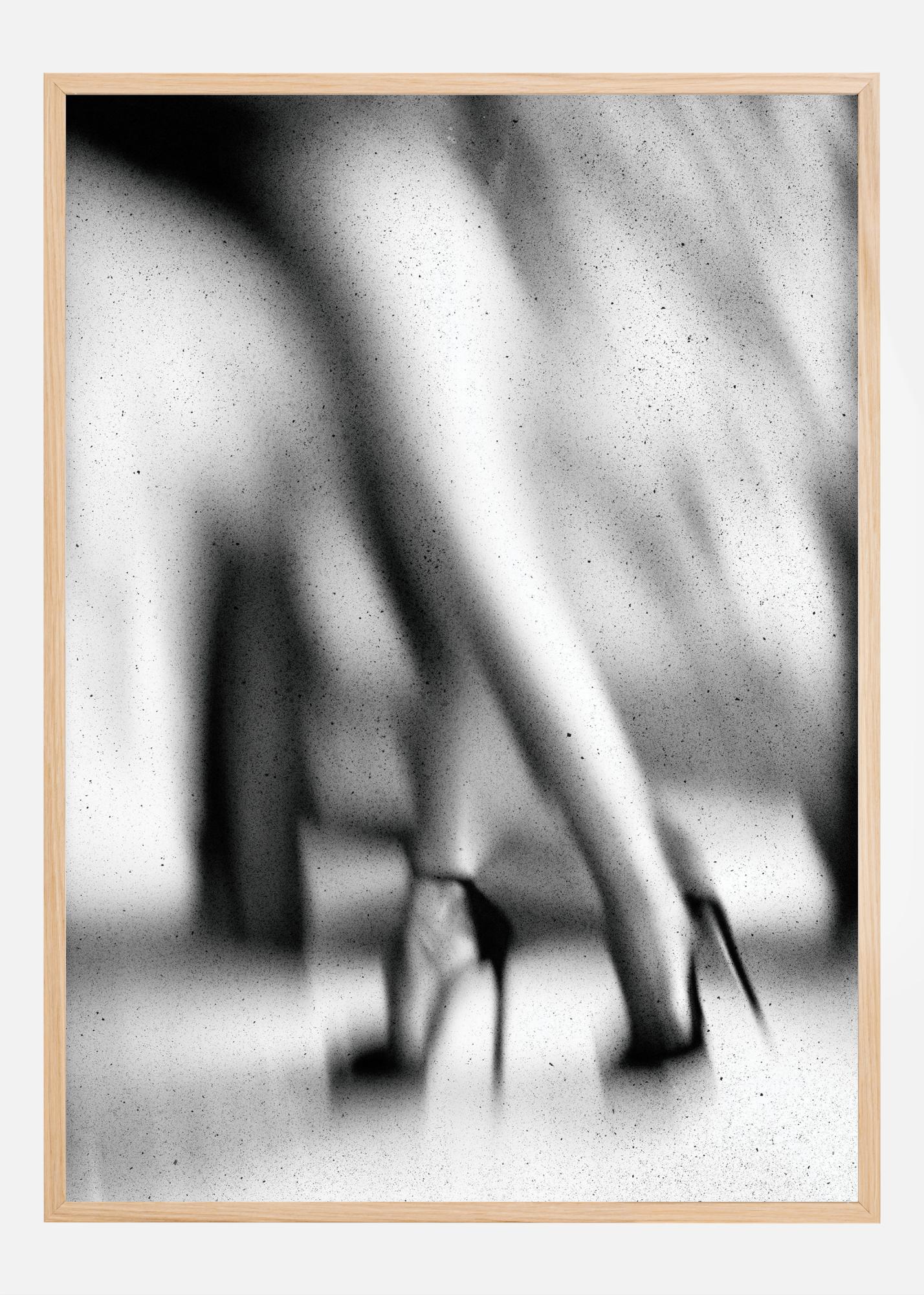 Questo poster artistico gioca con sfocature e contrasti per creare una sensazione di movimento e astrazione. Raffigura un paio di gambe con scarpe col tacco alto in una sfocatura atmosferica e quasi di movimento, il che conferisce all'opera un aspetto etereo e dinamico. La scala cromatica monocromatica del poster evoca una sensazione di sia eternità che modernità.