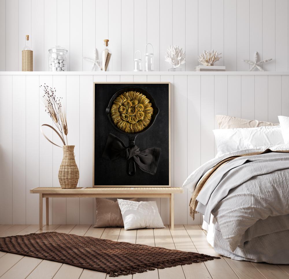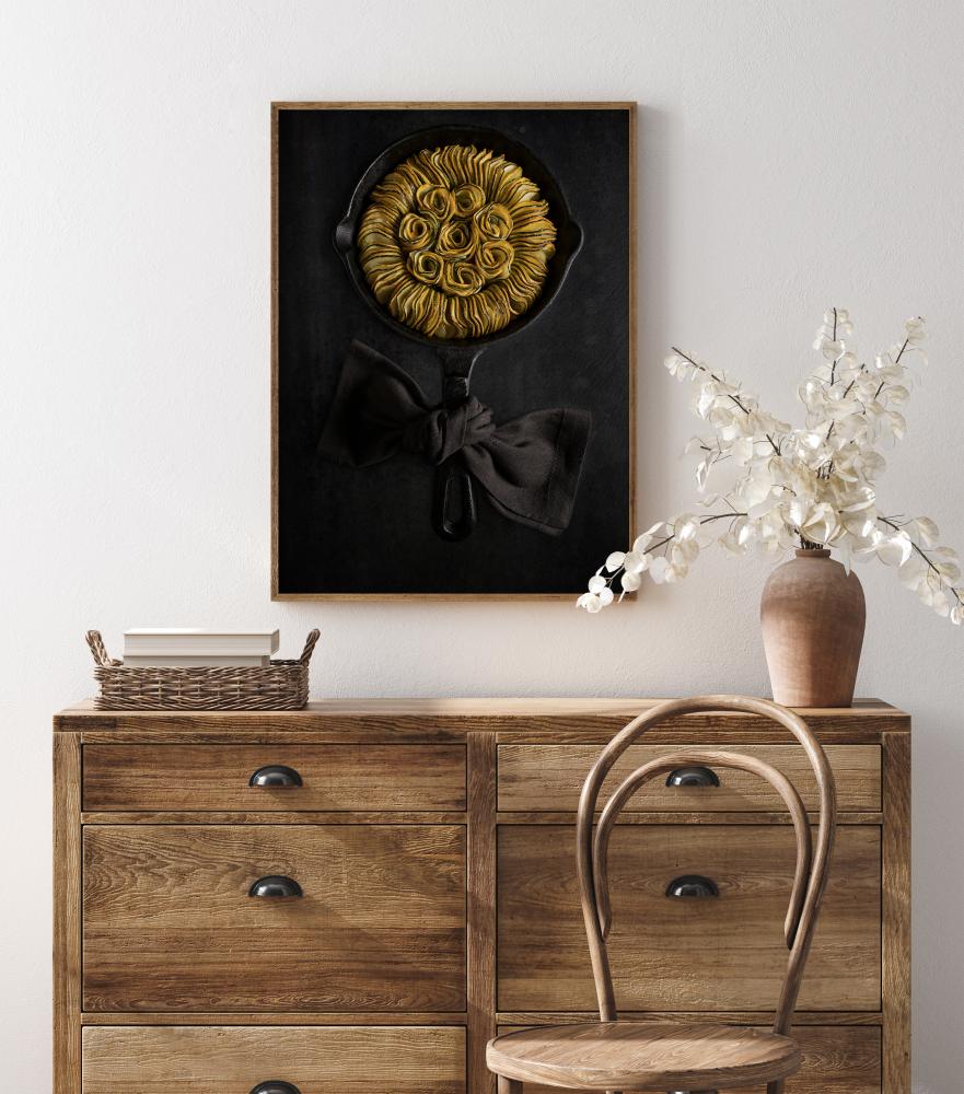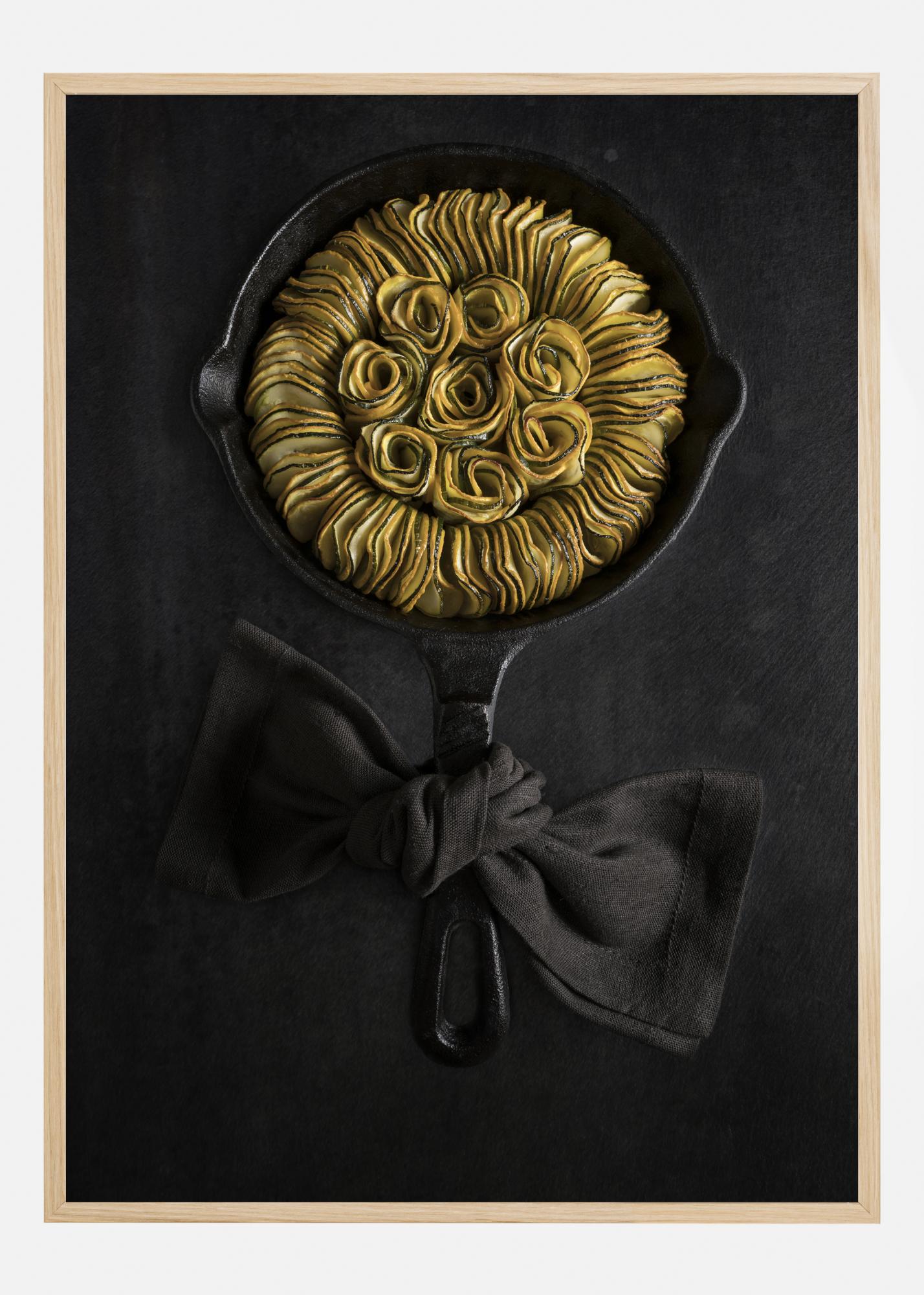 Un poster delizioso con una ratatouille di zucchine o squash elegantemente disposte in una padella di ghisa, creando una fantastica forma di girasole. Le zucchine gialle e verdi spiccano sulla padella nera con un fiocco di stoffa legato all'impugnatura. Appendilo nella tua cucina e vedi se riesci a preparare questo invitante piatto.